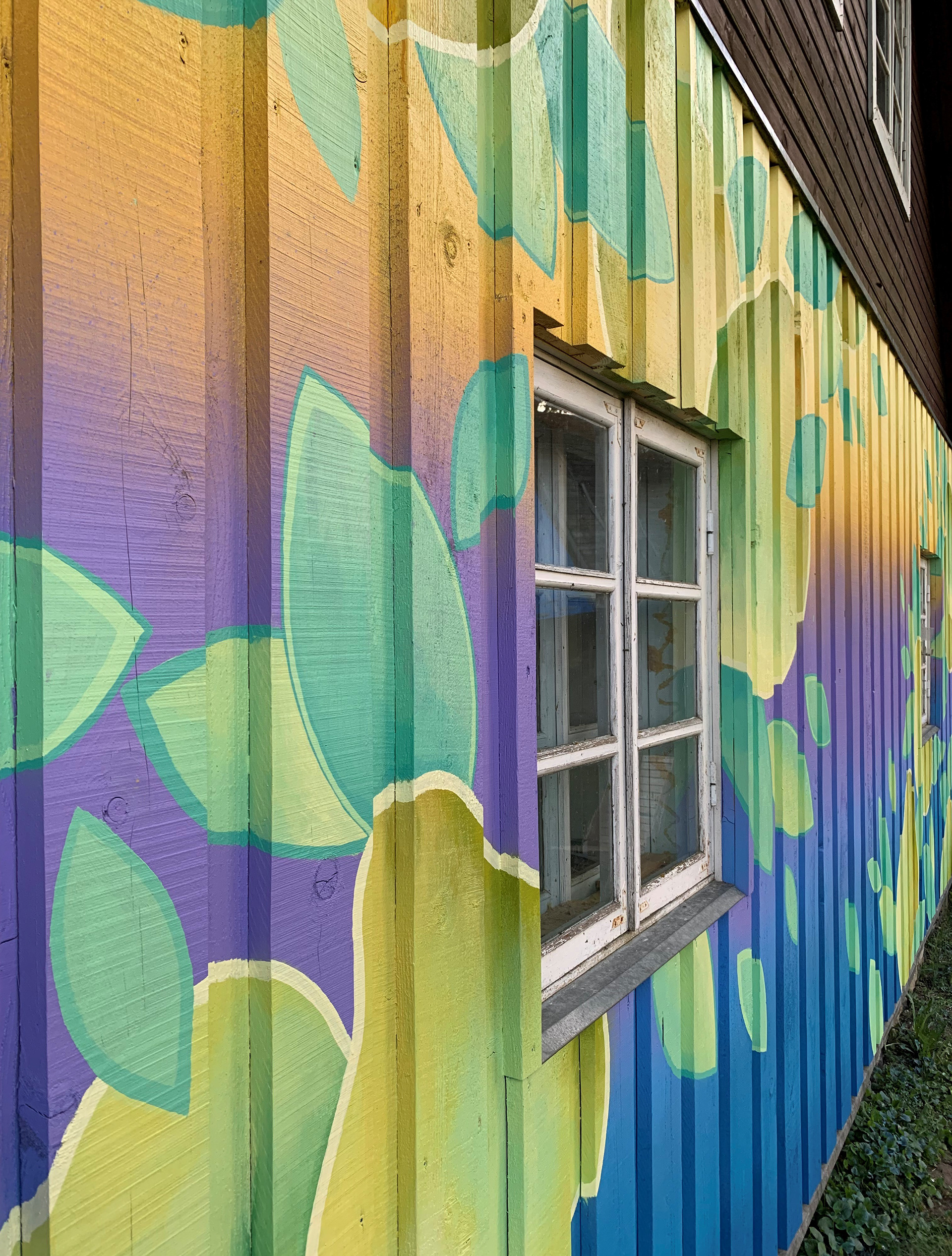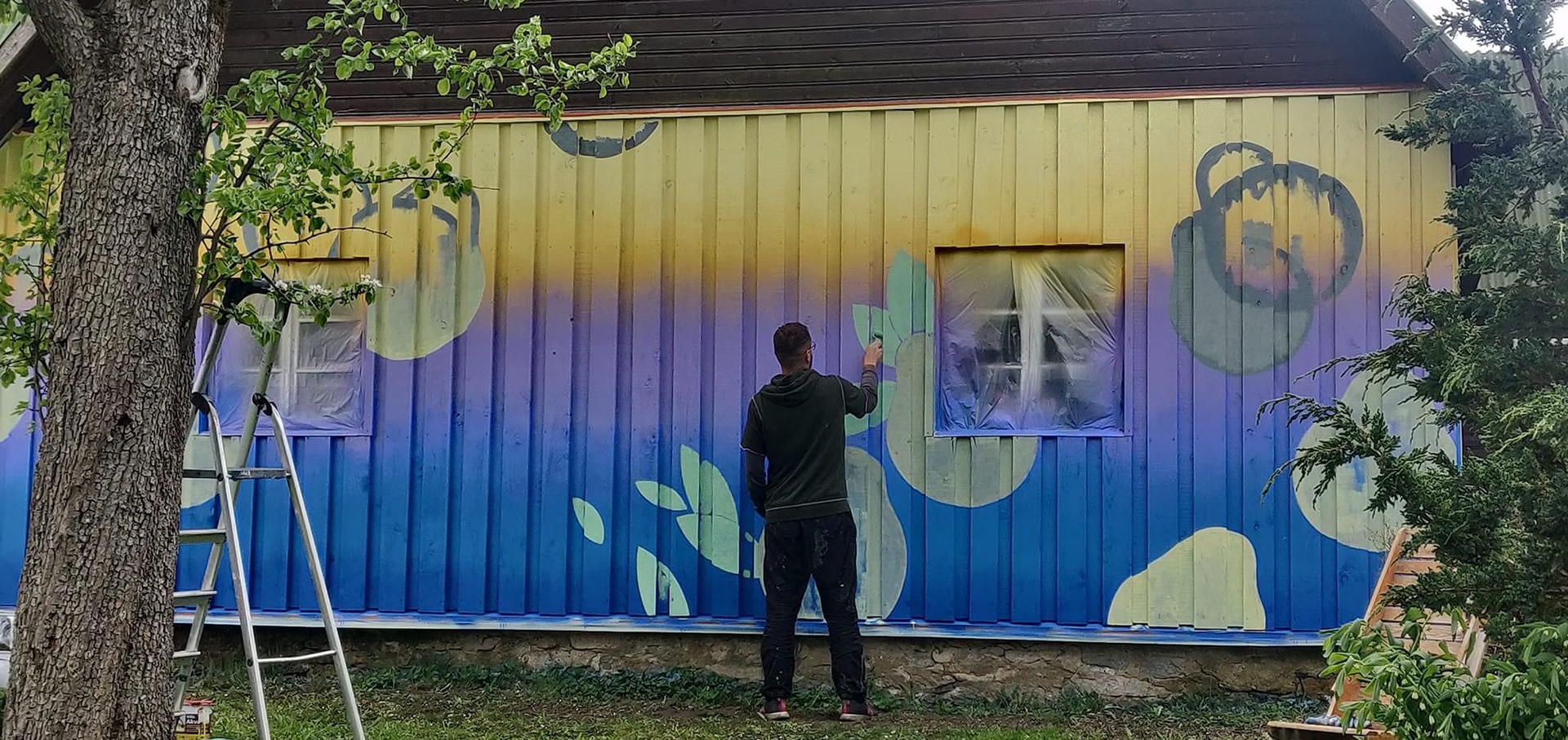 Such a plot was drawn immediately in my head when they said that this wall is on the side of the garden, where 7 large pear trees are grow. These pears are very tasty and they also make cider out of it. So I tried to convey the taste and mood of these fruits . Also, this wall itself, which has a very complex ribbed surface, was a challenge for me. Thanks to the owners for the trust, love and wonderful time spent there!